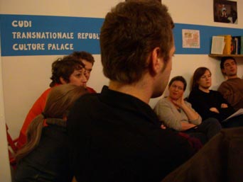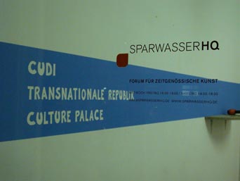 We, CUDI, Transnational Republic und Culture Palace/Sparwasser invite you to participate in a dialog and investigation of social and political methods and praxis within the discourse of art production. This will take place in the period between February 11. and February 24.. The rooms of Sparwasser will be a laboratory/working space for these to weeks, open to exchange information and to define new ways of art production in public.
