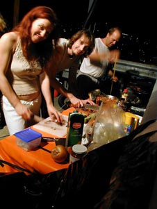 In addition to the free food and drinks, Etoy also provided two DJs that definitely caused the ocassional rockin' hip, but all in all did not hinder the social aspect of being together amongst interesting people. And it was interesting to see how diverse geekdom can get. We had WLAN access up there, but only a few had laptops, and the usual geeky behaviour seen at conferences did not surface. After all, we had nothing to prove to each other (isn't that what geeks are all about) and noone to convert. Instead, everyone was having a good time, and it was impossible to get bored.